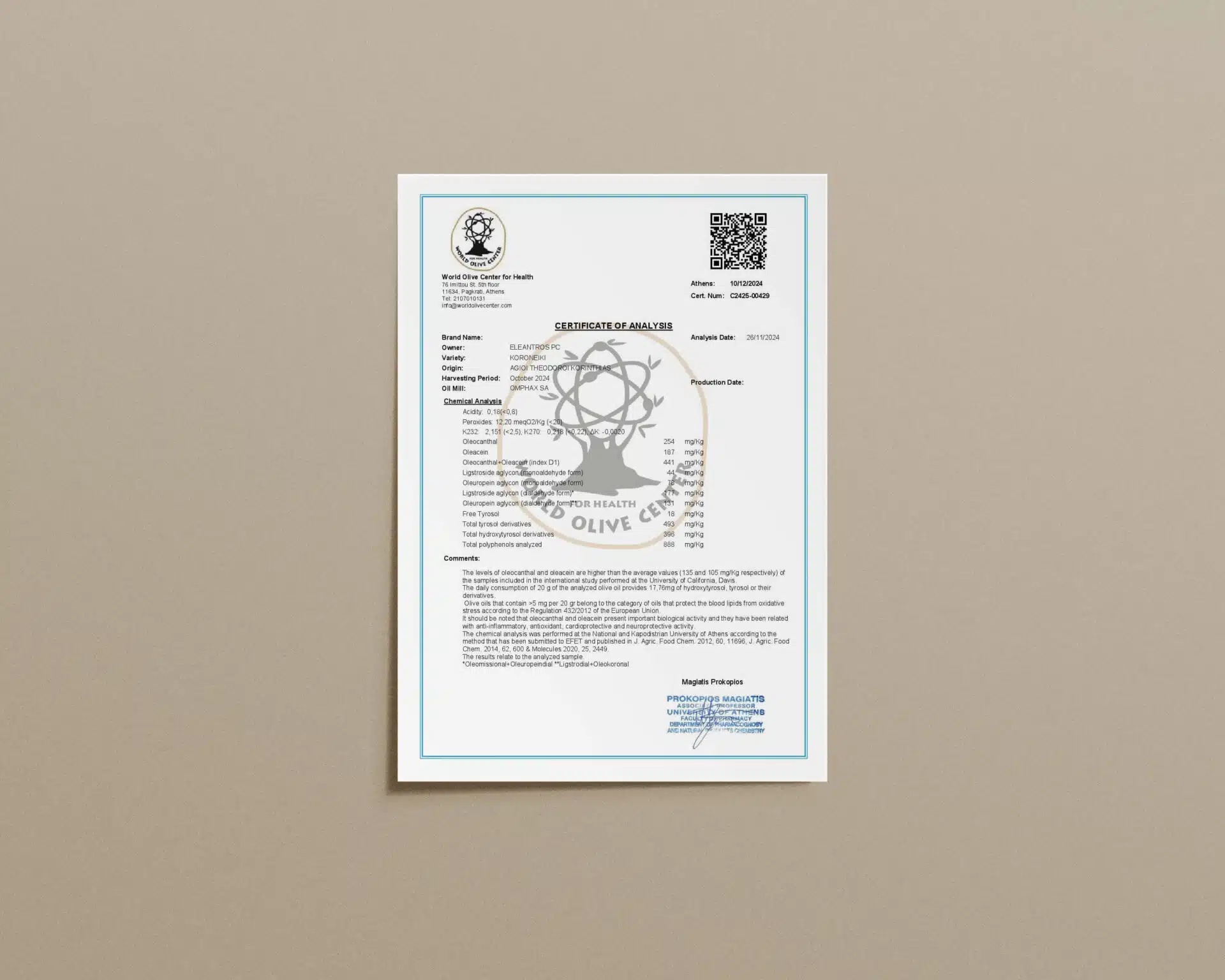 Hochwertiges ELEANDROS Bio Olivenöl aus 100 % Manaki-Oliven, kalt extrahiert Mitte Oktober. Mit nur 0,1 % Säuregehalt und einem hohen Polyphenolgehalt (888 mg/L) überzeugt dieses Öl durch fruchtig-grünen Geschmack, kräftige Frische und außergewöhnliche Reinheit – perfekt für Genießer und gesundheitsbewusste Feinschmecker.