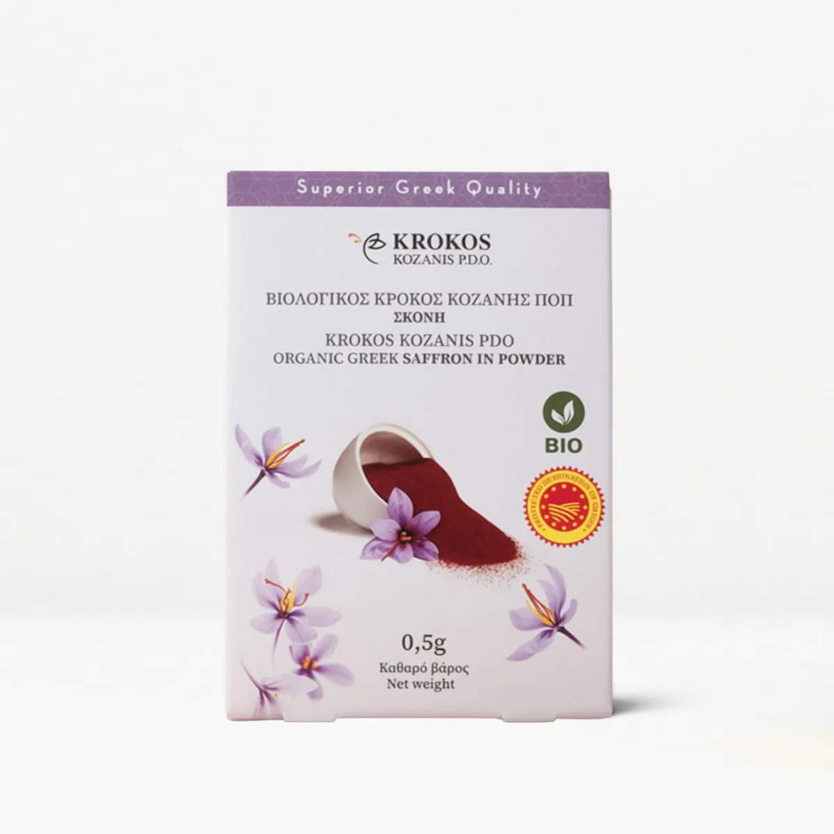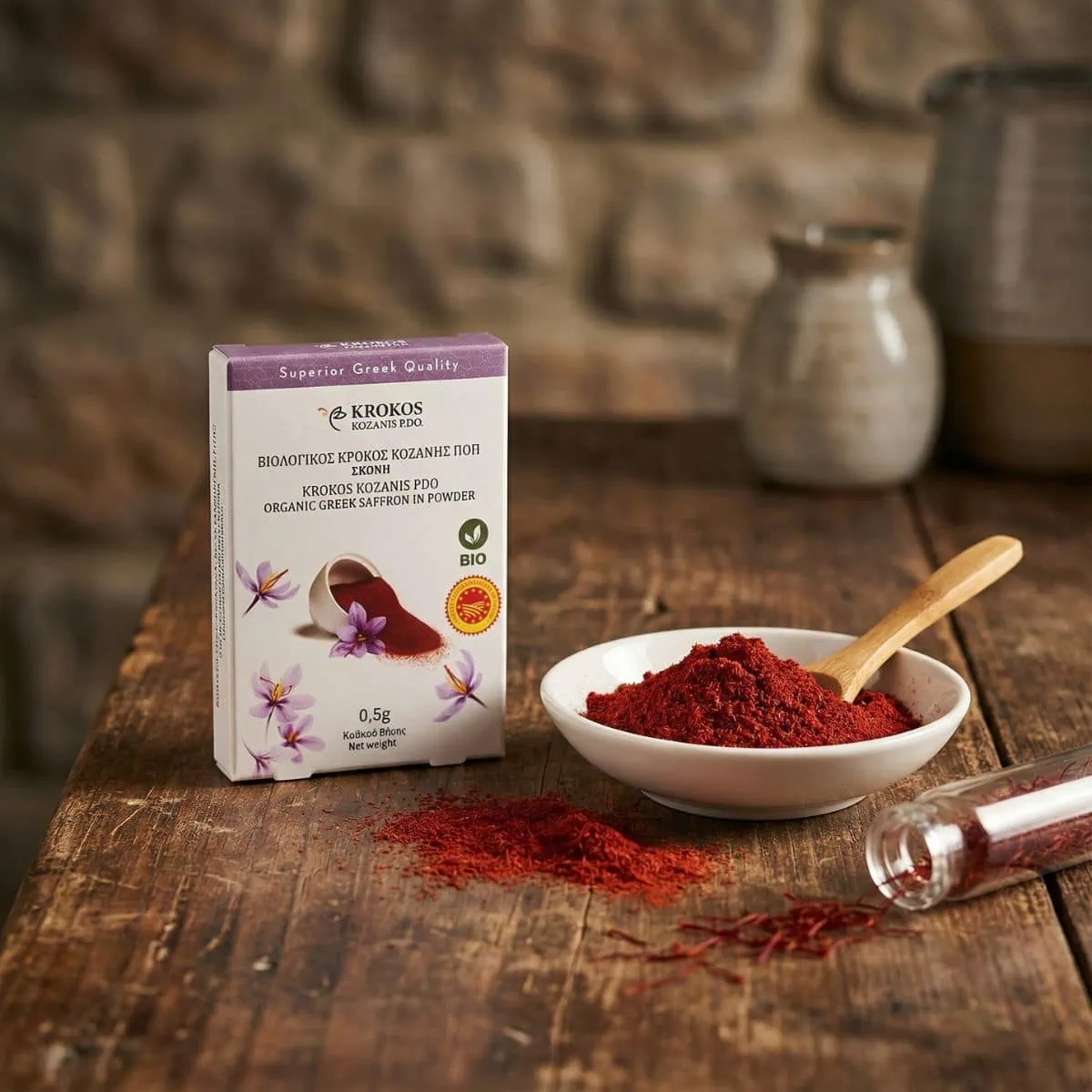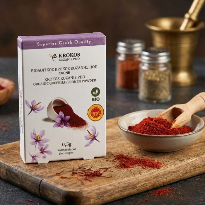 Griechischer Bio Safran Pulver von Krokos Kozanis – eine der besten Safransorten weltweit. Das fein gemahlene Pulver überzeugt mit intensivem Aroma und goldener Farbe. Ideal zum Verfeinern von Reis, Pasta, Fisch oder Saucen – echte griechische Gourmetqualität für Feinschmecker.