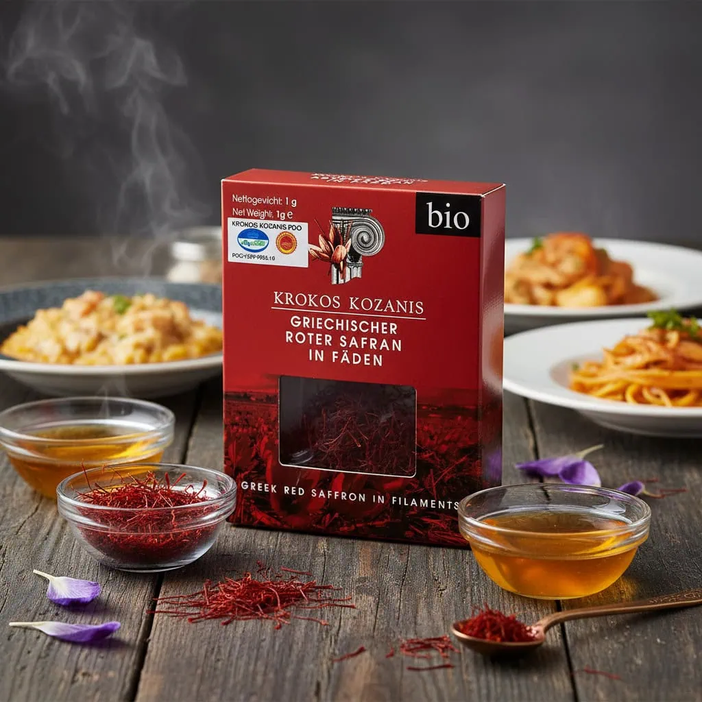 Roter Bio Safran in Fäden von KROKOS KOZANIS – eine der edelsten Safransorten Griechenlands. Die handverlesenen Blütenfäden verleihen Speisen goldene Farbe, feines Aroma und besondere Würze. Ideal für Reis, Pasta, Fisch, Suppen und Saucen – reine griechische Bio-Qualität für anspruchsvolle Feinschmecker.