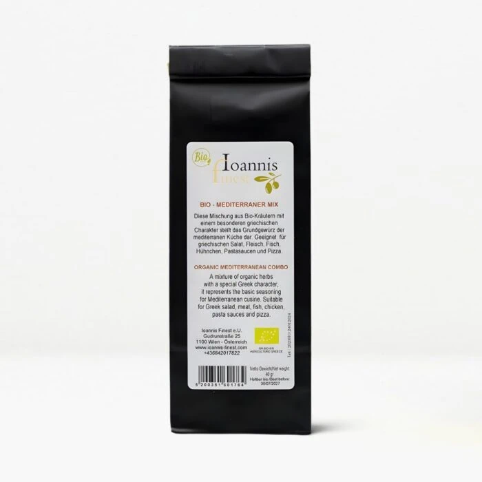 Mediterraner griechischer Kräutermix Bio von Ioannis Finest – eine harmonische Mischung aus Oregano, Thymian, Rosmarin und Basilikum. Ideal für Fleisch, Fisch, Pasta, Pizza und Salate. 100% naturrein, handverlesen und voller mediterraner Aromen – beste griechische Bio-Qualität für echte Genießer weltweit.