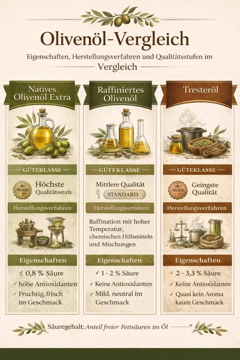 In diesem Artikel erfahren Sie, was natives Olivenöl extra wirklich bedeutet, wie es hergestellt wird, welche Rolle Herstellungsverfahren, Verarbeitung, Inhaltsstoffe und gesundheitliche Aspekte spielen und woran Sie Qualität zuverlässig erkennen.